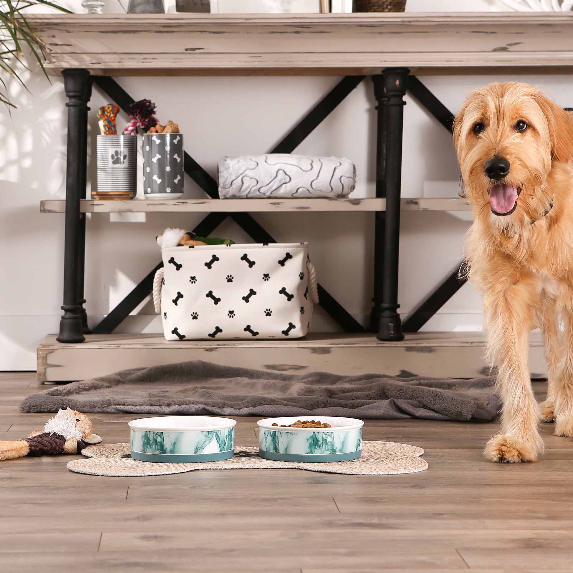 - Delight your hungry pup with this ceramic bowl in a fun print with a stay-put silicon bottom. Suitable for food and water.
